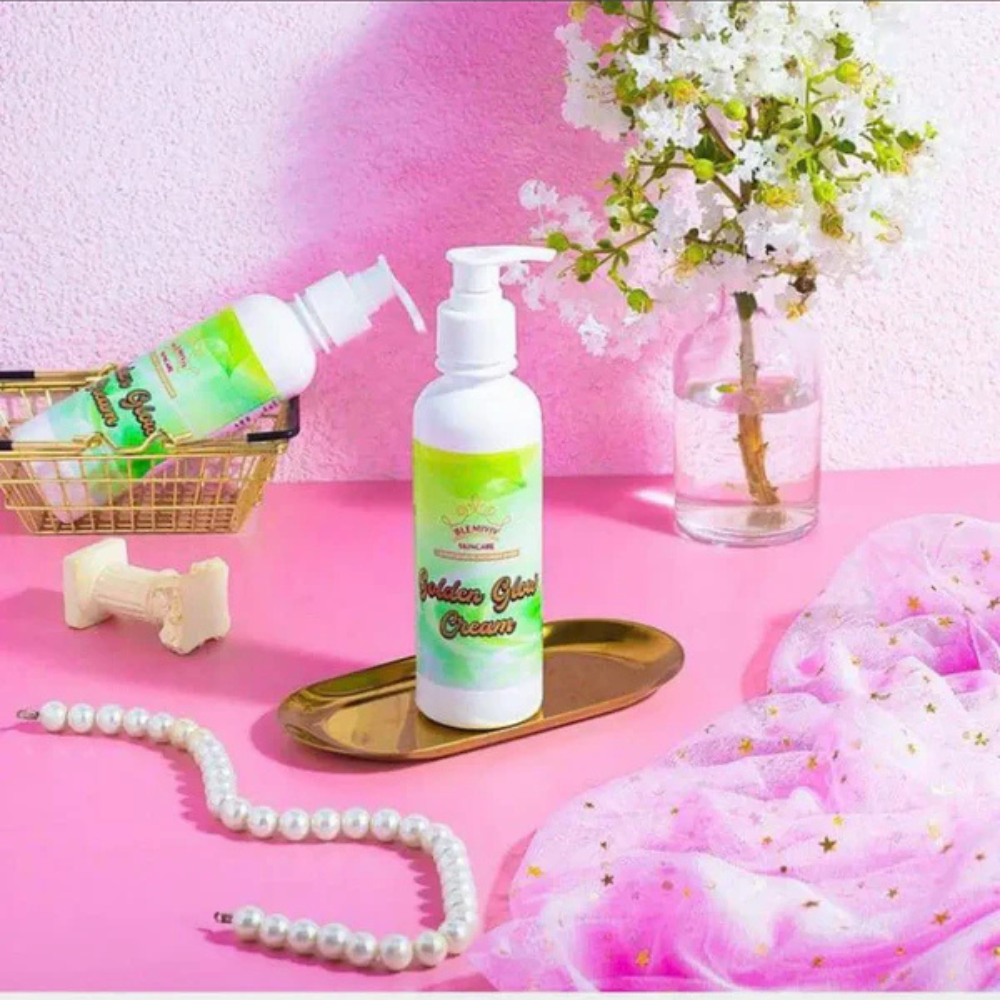 The Golden Glow Body Cream is for anyone who wants light skin with a golden glow. This cream is a brightening skin lightener, moisturizer, with a bit of vitamin E. It reflects the sun's light and reduces the appearance of dark circles, fine lines, and wrinkles.